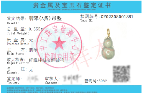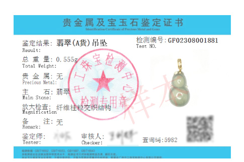 贵金属及宝玉石鉴定证书正反面